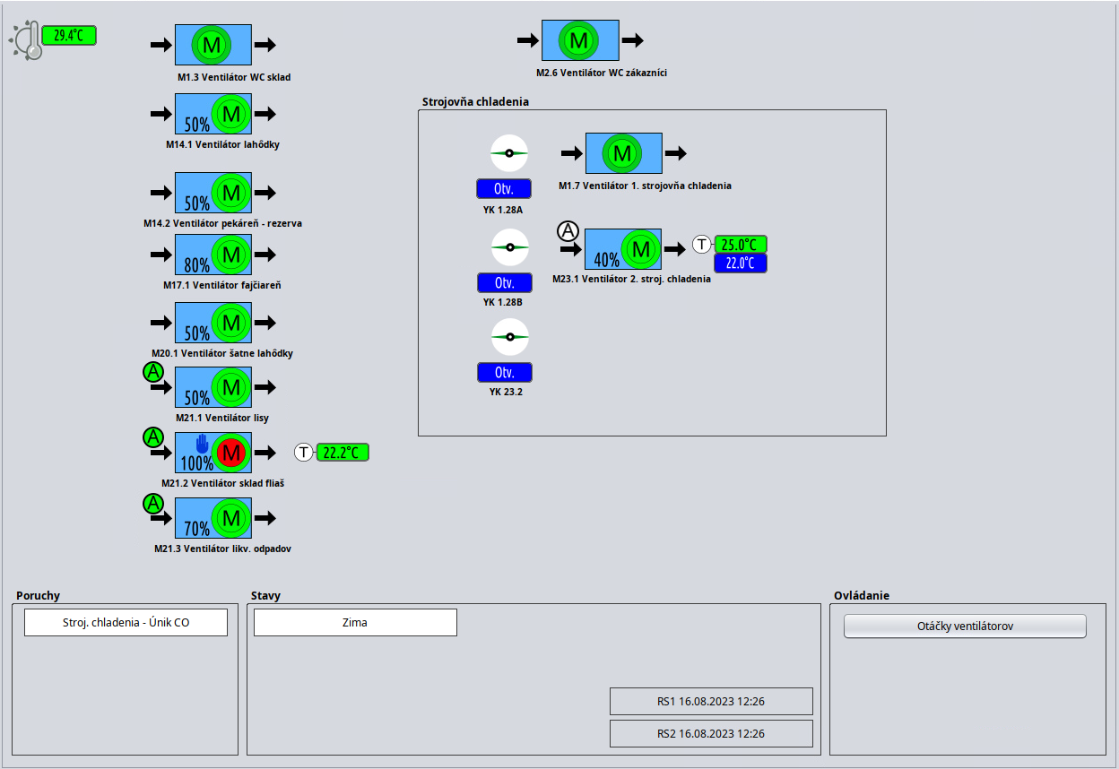 Zobrazuje stav Indikačného panelu poruchovej signalizácie MBT a ovládanie režimov Leto/Zima, prevetranie VZT, Dverné clony a režimu nočná.