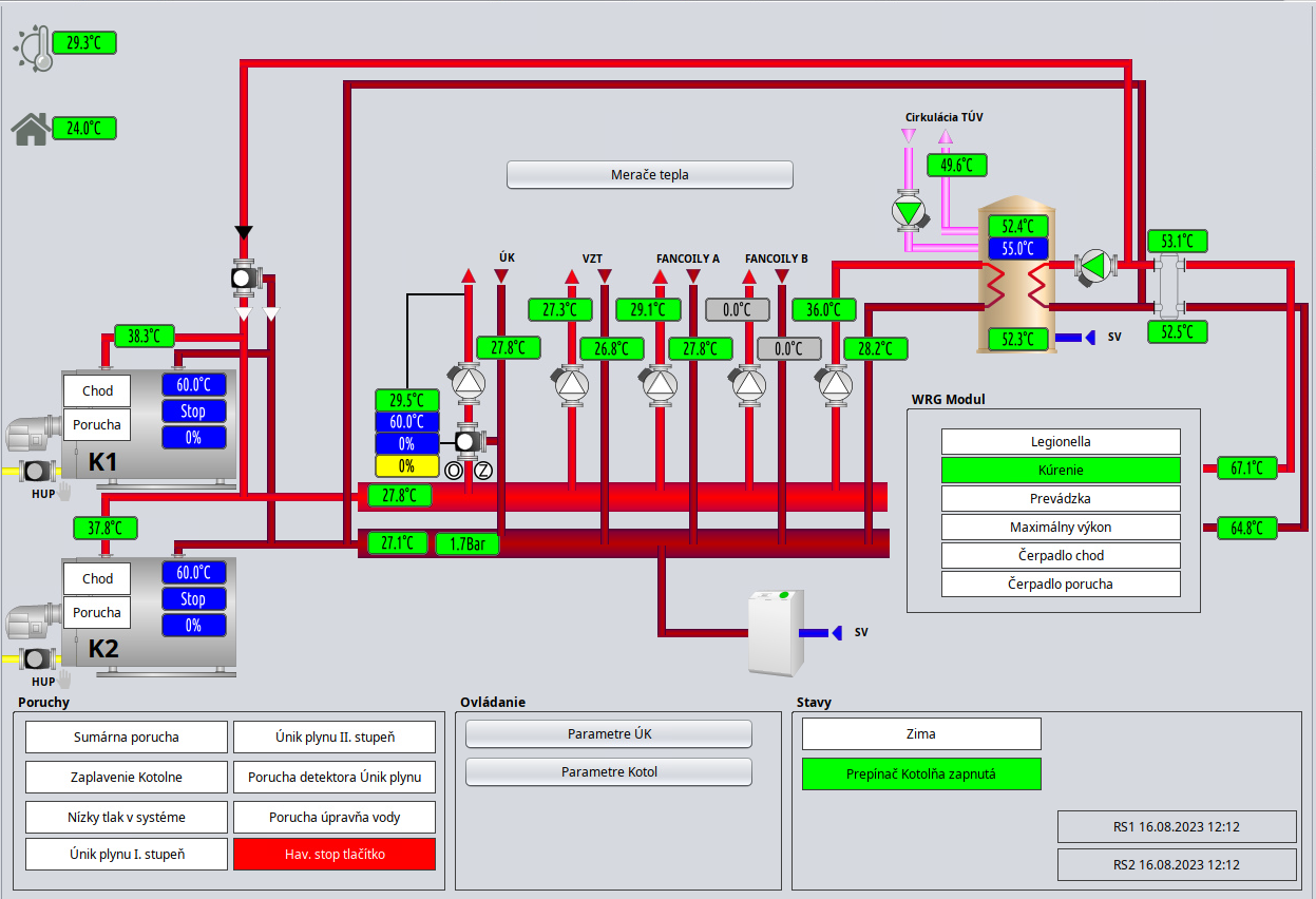Zobrazuje stav Indikačného panelu poruchovej signalizácie MBT a ovládanie režimov Leto/Zima, prevetranie VZT, Dverné clony a režimu nočná.